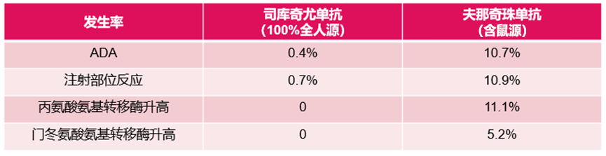 司库奇尤单抗采用100%全人源抗体,与人体免疫系统兼容性高,ADA发生率低。数据显示,治疗60周,ADA发生率仅0.4%,注射部位反应发生率仅0.7%。而人源化抗体夫那奇珠单抗治疗36周ADA发生率达10.7%,治疗52周注射部位反应发生率为10.9%。