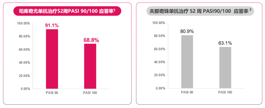 注射部位反应影响治疗依从性,司库奇尤单抗治疗52周停药率仅1.8%,且不会造成肝功能损伤。而夫那奇珠单抗治疗52周,常见不良反应有注射部位反应和肝酶升高。