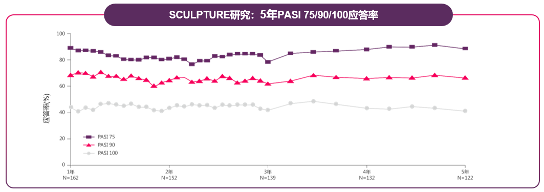 司库奇尤单抗疗效持续稳定,第5年PASI应答和首年相当,9年药物留存率高达73%,而夫那奇珠单抗无超1年长期疗效数据。